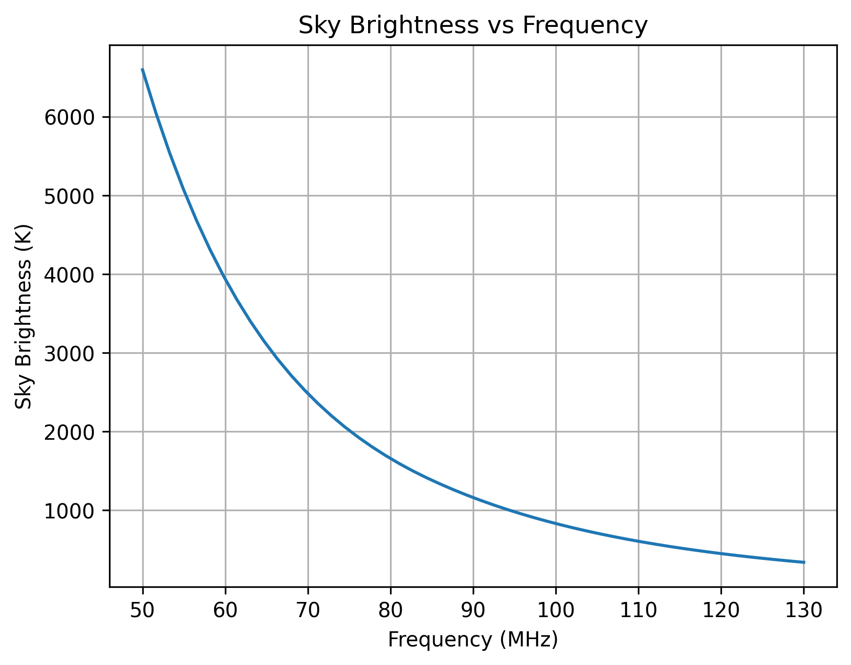 The convolved sky brightness shows the expected steep frequency dependence, dropping from ~6500 K at 50 MHz to ~400 K at 130 MHz. This $\approx \nu^{-2.5}$ scaling is characteristic of galactic synchrotron emission, the dominant foreground component at these frequencies.