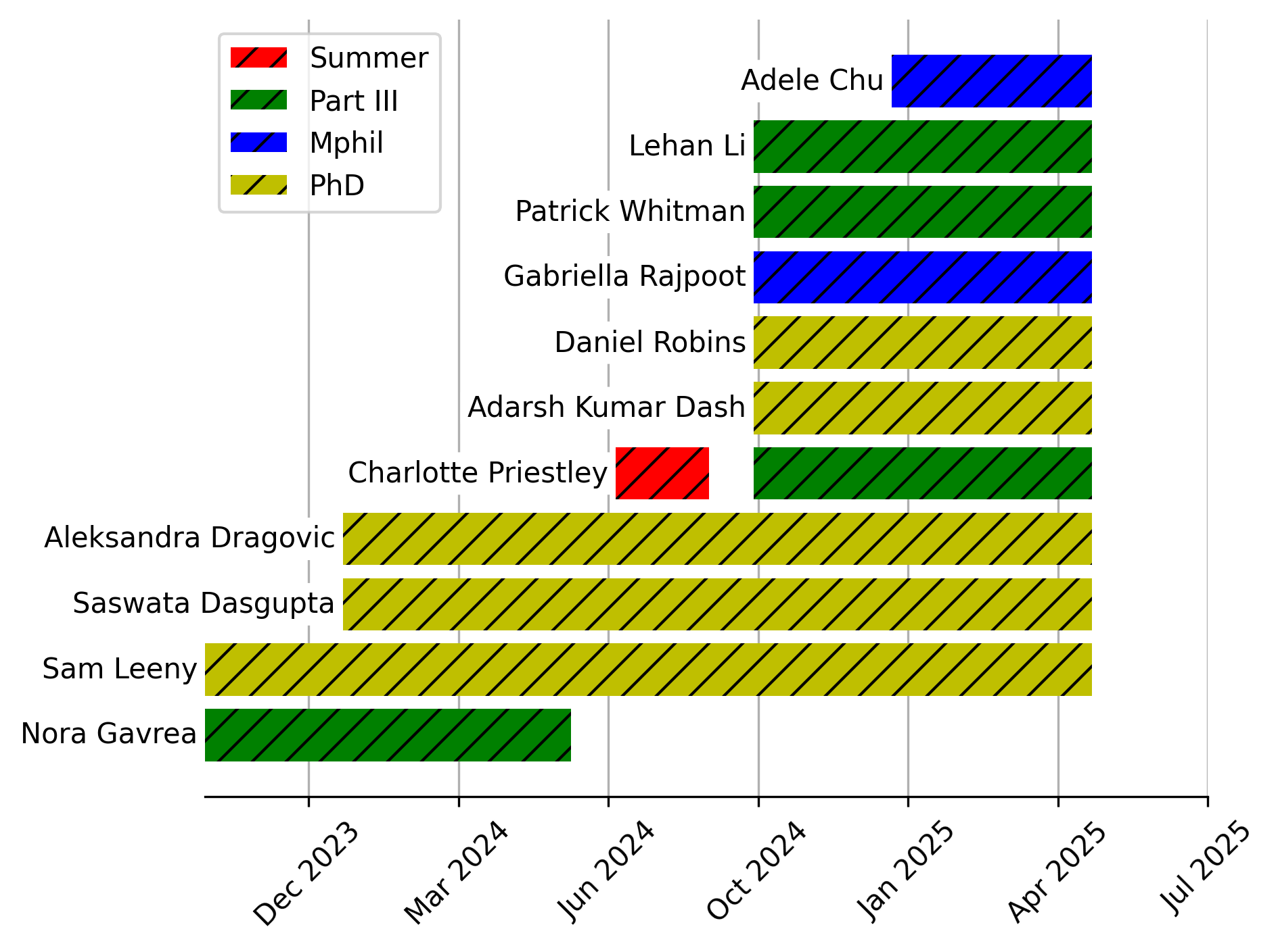 - Jul 2024 - Jun 2025: Co-supervision of Charlotte Priestley with Will Handley for a summer project and Part III Masters Project, University of Cambridge. Working on density estimation and Simulation Based Inference.